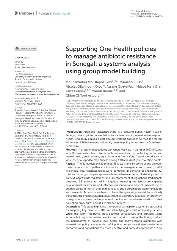 Antibiotic resistance (ABR) in Senegal is shaped by tightly linked human, animal, and environmental factors. This study uses a participatory systems approach to map how these drivers interact and identify where policy action could make the most meaningful impact.